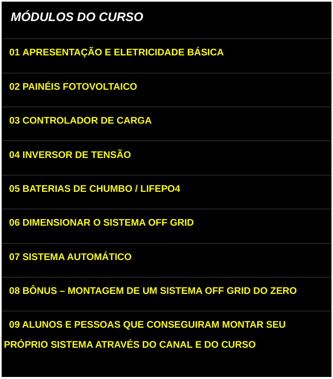 ✔ Curso completo, 9 módulos, 51 aulas com mais de 7 horas em vídeos + complementos, totalmente passo a passo, você vai aprender e ver na prática do inicio ao fim como criar seu sistema de energia solar Off Grid.