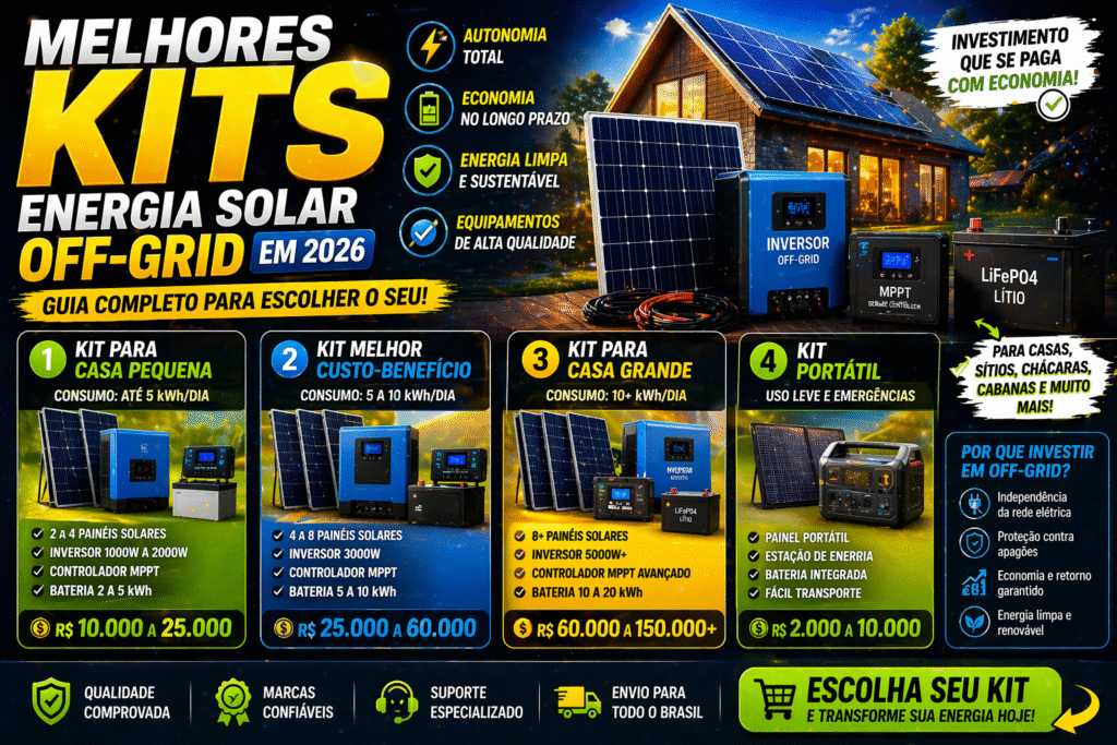 Neste guia completo, portanto, você vai conhecer os melhores kits solar off-grid em 2026, selecionados com base em custo-benefício, desempenho real e adequação a diferentes perfis de uso. Além disso, vamos mostrar o que observar antes de comprar e como evitar os erros mais comuns nessa decisão. Dessa forma, você estará totalmente preparado para fazer a melhor escolha.